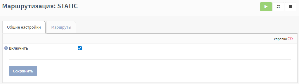 Перейти во вкладку «Общие настройки» подраздела настройки статических маршрутов FRR («Маршрутизация» - «STATIC»), установить флажок для параметра «Включить» (см. Рисунок – Статическая маршрутизация FRR) и нажать кнопку «Сохранить».