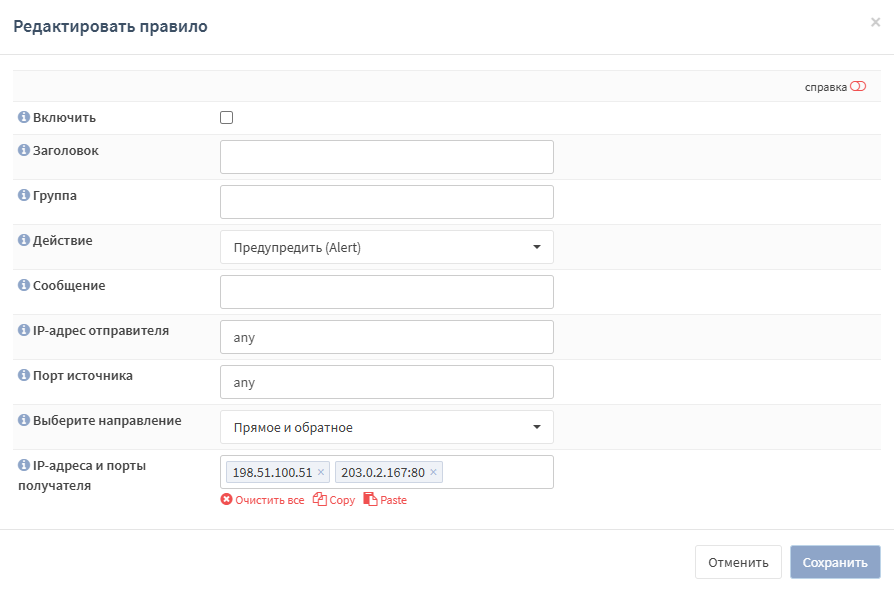 Для создания правила СОВ с целью обеспечения контроля передачи пакетов определённым хостам необходимо выполнить следующие действия: