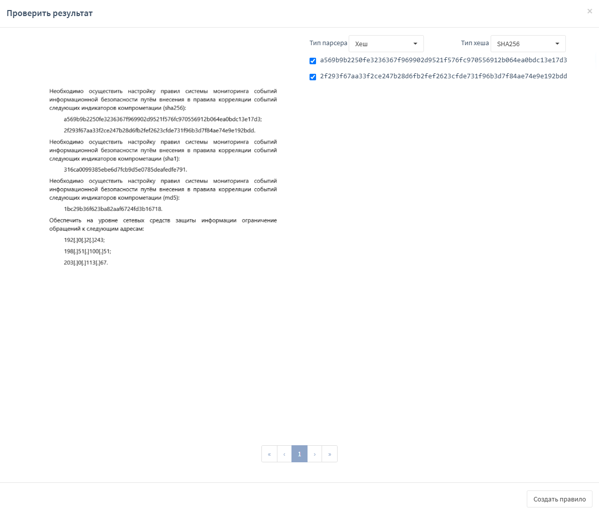 нажать кнопку «Проверить результат». В результате автоматически откроется окно, в левой части которого будет отображён исходный документ, а в правой части – параметр «Тип парсера» и поля, содержащие распознанные значения, соответствующие условиям поиска (см. Рисунок – Проверка результатов сканирования). В случае выбора в выпадающем списке параметра «Тип парсера» значения «Хеш» дополнительно появится параметр «Тип хеша», в выпадающем списке которого возможно указать один из следующих типов – «SHA256», «SHA1», «MD5». Переход к другим страницам импортированного документа возможен с помощью кнопок навигации в нижней части окна;