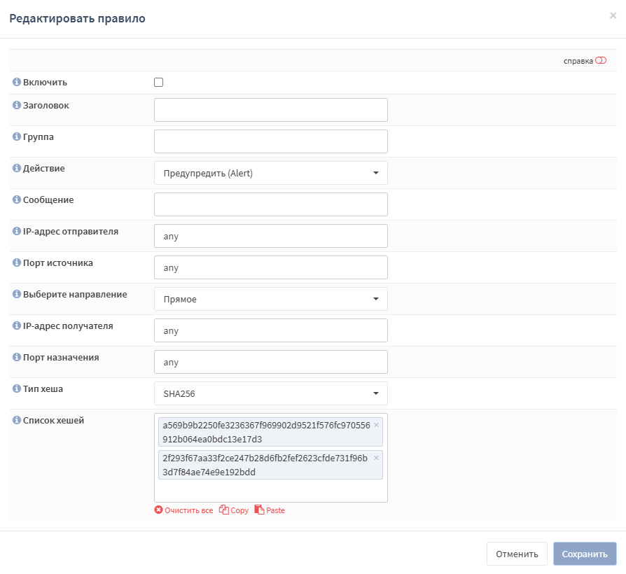 ARMA FW позволяет создавать правила СОВ с целью обеспечения контроля передачи файлов, основанном на обнаружении хеш-сумм следующих функций хеширования: