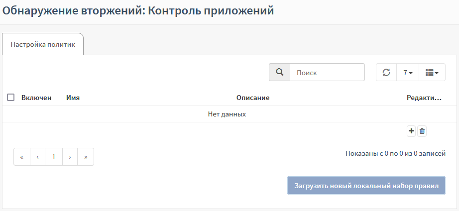 Перейти в подраздел указания политик контроля приложений («Обнаружение вторжений» - «Контроль приложений») и нажать кнопку «Загрузить новый локальный набор правил» (см. Рисунок – Добавление политик контроля приложений).