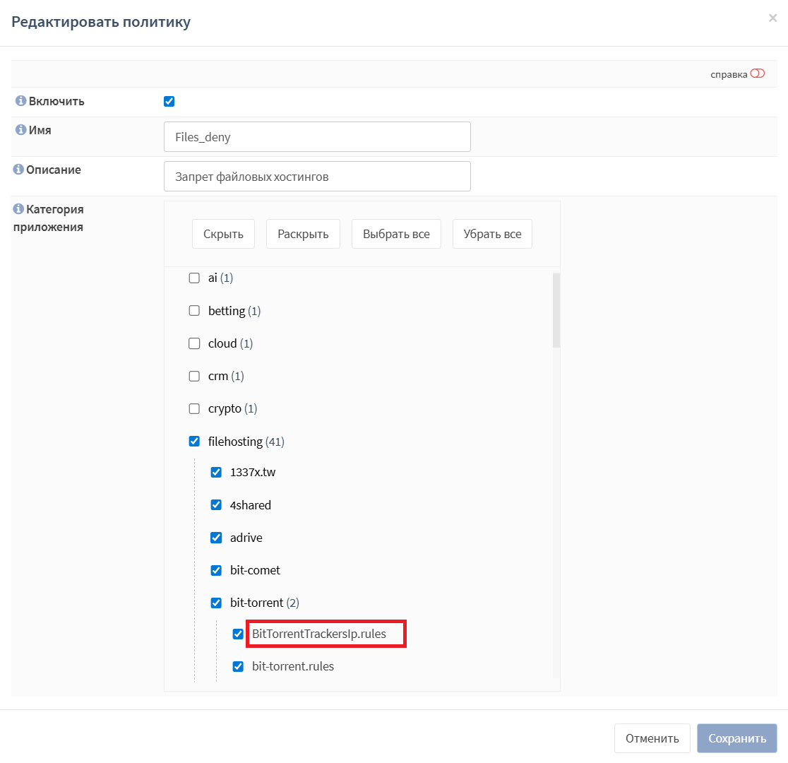 Сгенерированный набор правил появится в форме настройки политики контроля приложений, в перечне параметра «Категория приложения» (см. Рисунок – Набор правил контроля bittorrent).