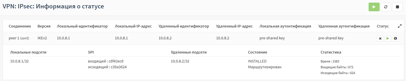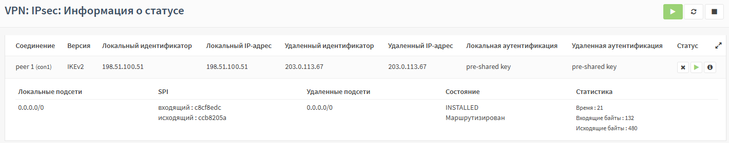 Для проверки работоспособности подключения необходимо на каждом ARMA FW перейти в подраздел статуса IPsec («VPN» - «IPsec» - «Информация о статусе»), нажать кнопку «», затем кнопку «» и убедиться в наличии активного соединения (см. Рисунок – ARMA FW2: Информация о статусе IPsec VPN).