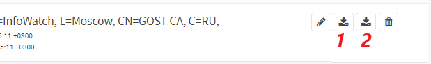 Сертификат созданного центра сертификации необходимо экспортировать, нажав кнопку «Экспортировать сертификат CA» (см. Рисунок – Экспорт сертификата СА) в подразделе полномочий («Система» - «Доверенные сертификаты» - «Полномочия»).