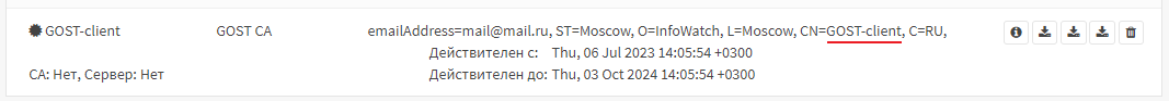 «Данные сертификата» – скопированное значение из экспортированного файла сертификата клиента (см. «Создание сертификатов ГОСТ» настоящего руководства);