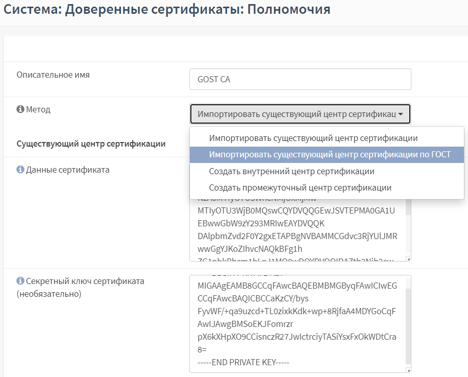создание доверенного центра сертификации – в подразделе полномочий («Система» - «Доверенные сертификаты» - «Полномочия») необходимо выбирать значение «Создать внутренний центр сертификации по ГОСТ» для параметра «Метод» в форме создания центра сертификации;
