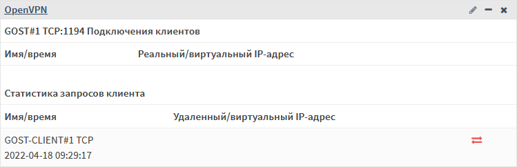 Виджет «OpenVPN» (см. Рисунок – Виджет «OpenVPN») отображает настроенные OpenVPN серверы и статистику запросов подключений.