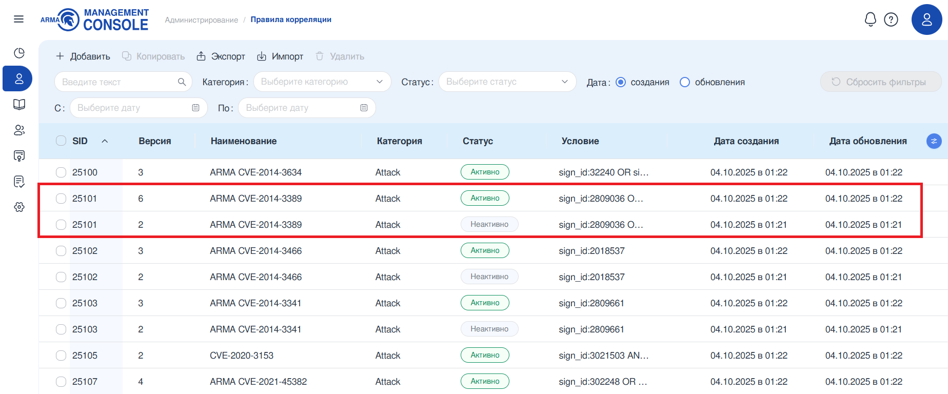 При включении какого-либо правила корреляции может появиться предупреждение о наличии включённого ранее правила с идентичным SID. Данная ситуация возникает вследствие наличия нескольких правил корреляции отличающихся версий, но с одинаковым SID (см. Рисунок – Правила корреляции с идентичными SID).