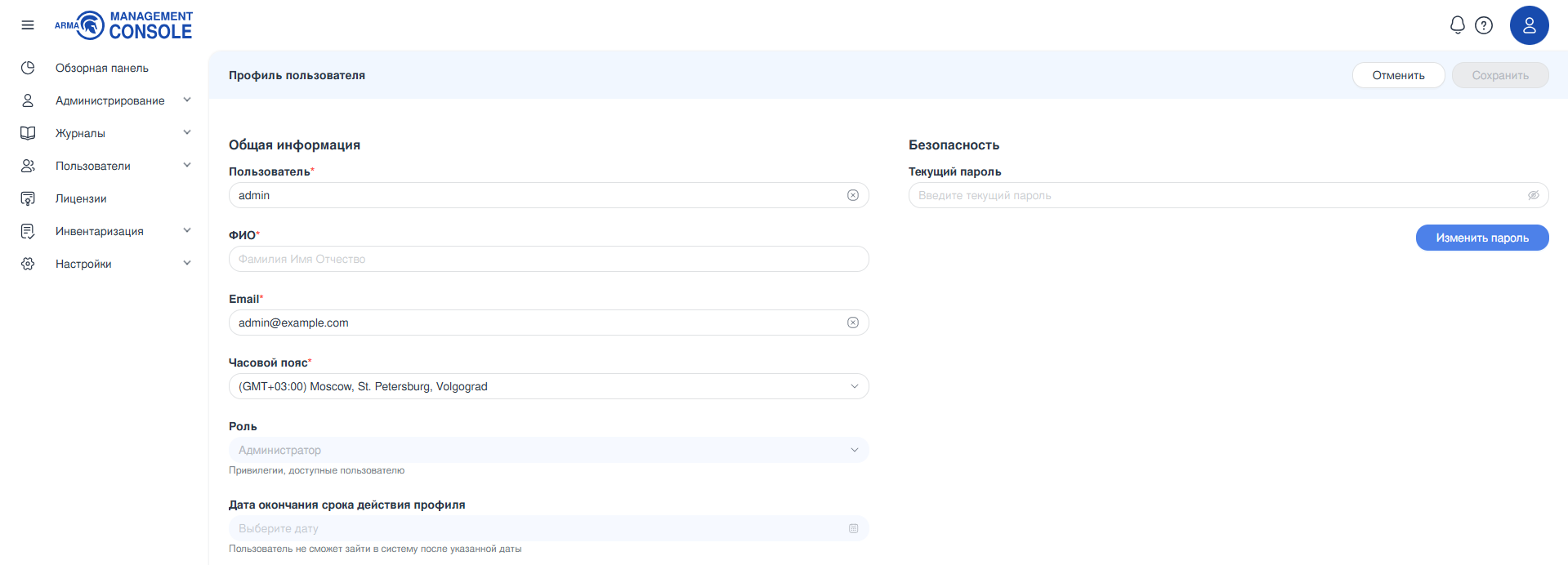 Для первоначальной УЗ с ролью администратор необходимо отредактировать информацию профиля, заполнив поле «ФИО», для корректного отображения действий пользователя в разделе меню «Действия».