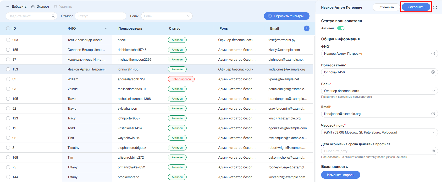 Чтобы изменить один или несколько параметров УЗ, достаточно внести изменения в карточку пользователя и нажать кнопку «Сохранить» в правом верхнем углу.