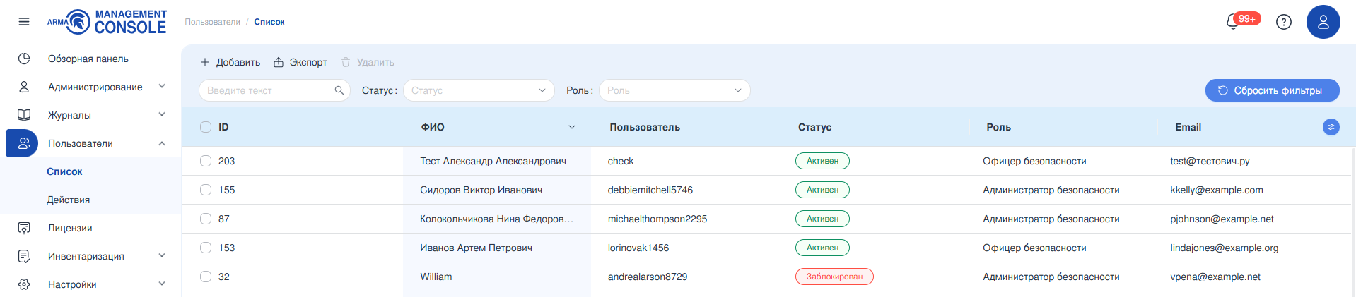 Подраздел меню «Список» отображает все УЗ, зарегистрированные в ARMA MC. Для перехода в подраздел на панели навигации необходимо выбрать в разделе меню «Пользователи» подраздел «Список» (см. Рисунок – Список пользователей).