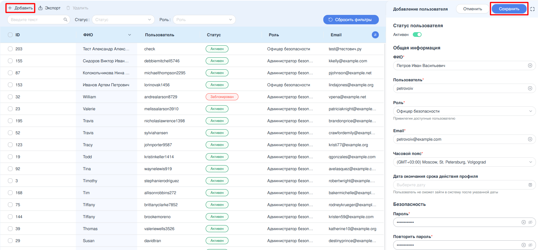 Нажать кнопку «Сохранить» в верхней части карточки «Добавление пользователя».
