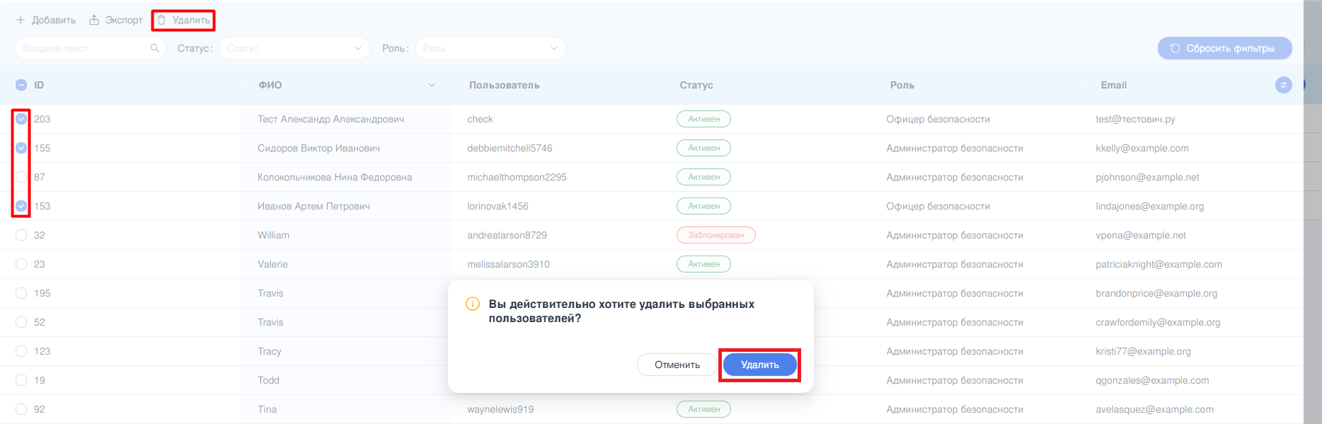 В появившемся окне необходимо подтвердить удаление, нажав кнопку «Удалить» (см. Рисунок – Удаление пользователей). Текст подтверждения может незначительно отличаться в зависимости от количества удаляемых пользователей и наличия назначенных на них нерешённых инцидентов.