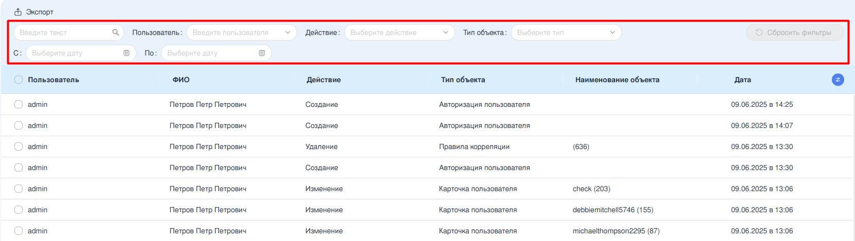 Фильтрация по полю «Тип объекта» позволяет отфильтровать данные по типу объекта, над которым было совершено действие. Поле «Тип объекта» содержит выпадающий список и предоставляет выбор из следующих вариантов значений: