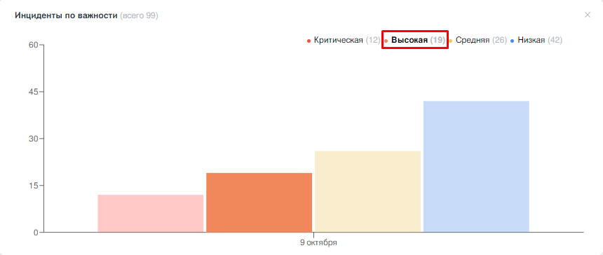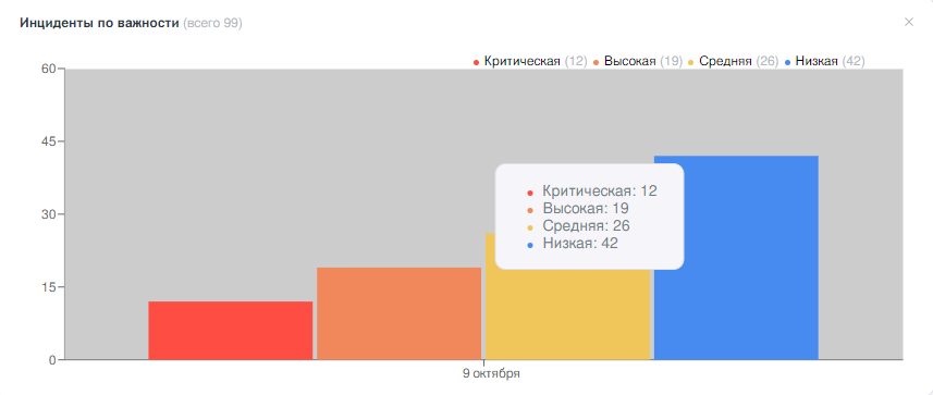 При наведении на диаграмму появится окно, в котором дублируется значение текстового поля с градацией инцидентов по важности и указанием их количества (см. Рисунок – Количество инцидентов по важности).