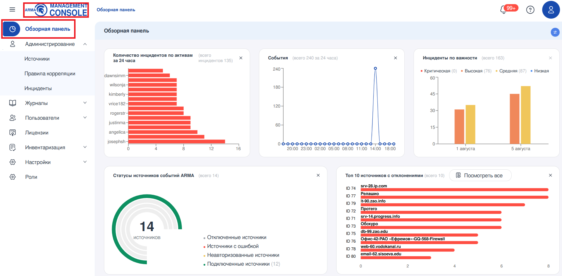 Для перехода на страницу «Обзорная панель» необходимо нажать на логотип ARMA MC или открыть раздел меню «Обзорная панель» (см. Рисунок – Обзорная панель).
