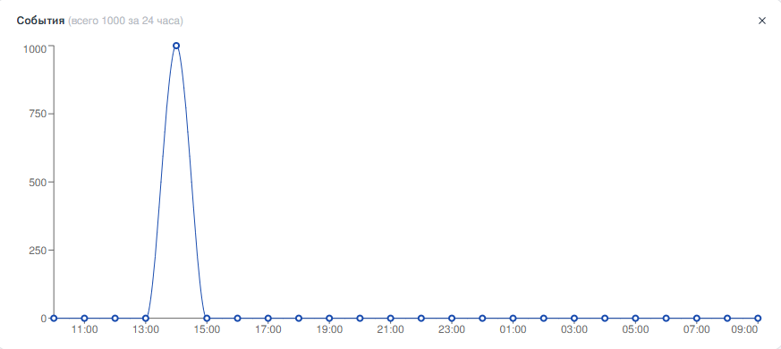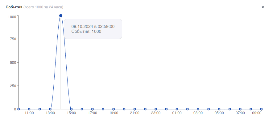 При наведении на точки диаграммы отображается дата, отрезок времени и количество зарегистрированных в это время событий (см. Рисунок – Отображение количества событий).