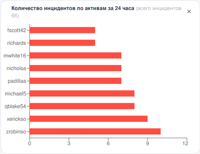 «Количество инцидентов по активам за 24 часа» (см. Виджет «Количество инцидентов по активам за 24 часа»);