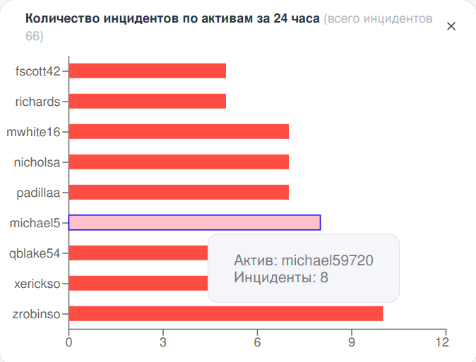 При наведении на столбцы диаграммы отображается наименование актива и количество пришедших с него инцидентов (см. Рисунок – Отображение инцидентов на активе).