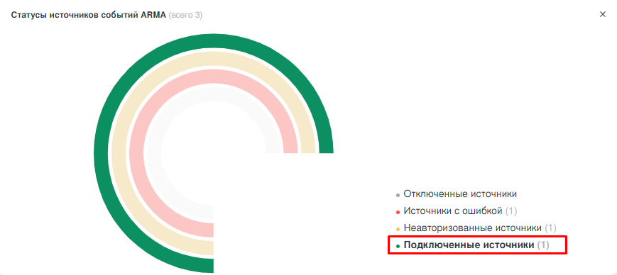 Виджет «Статусы источников событий ARMA» отображает информацию о количестве источников событий (см. События настоящего руководства), подключённых к ARMA MC, и их статусе. Информация представлена в виде диаграммы (см. Рисунок – Виджет «Статусы источников событий ARMA»).
