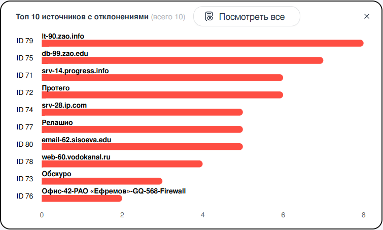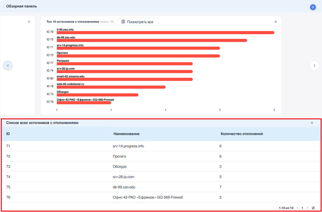 Нажатие на элемент «Посмотреть все» позволяет просмотреть данные по источникам в виде таблицы «Список всех источников отклонений» (см. Рисунок – Виджет «Топ 10 источников с отклонениями»).