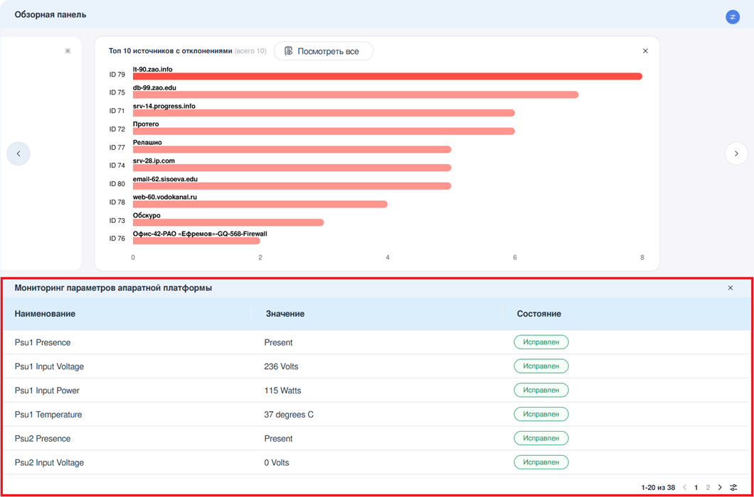 При нажатии на столбец выводится таблица «Мониторинг параметров аппаратной платформы», содержащая список всех полученных параметров источника (см. Рисунок – Виджет «Топ 10 источников с отклонениями»).