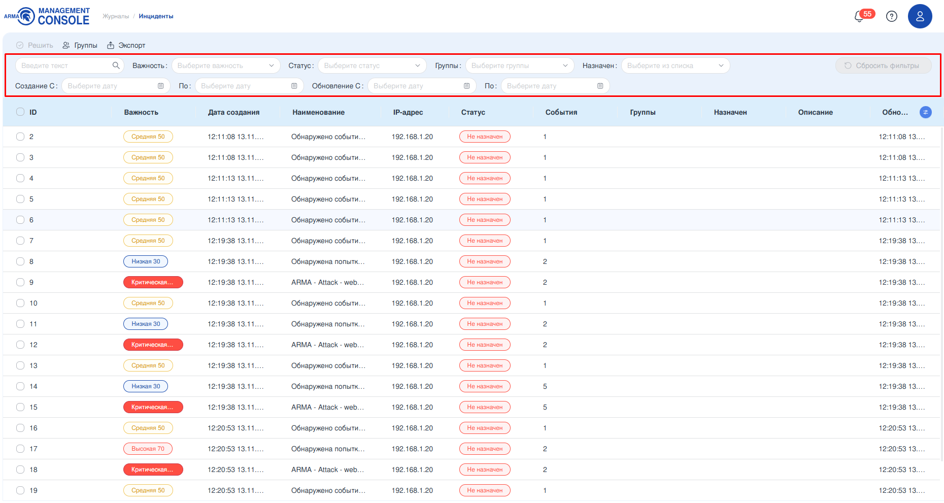 Фильтрация по полю «Группы» позволяет отфильтровать данные по группам, в которые включены инциденты.