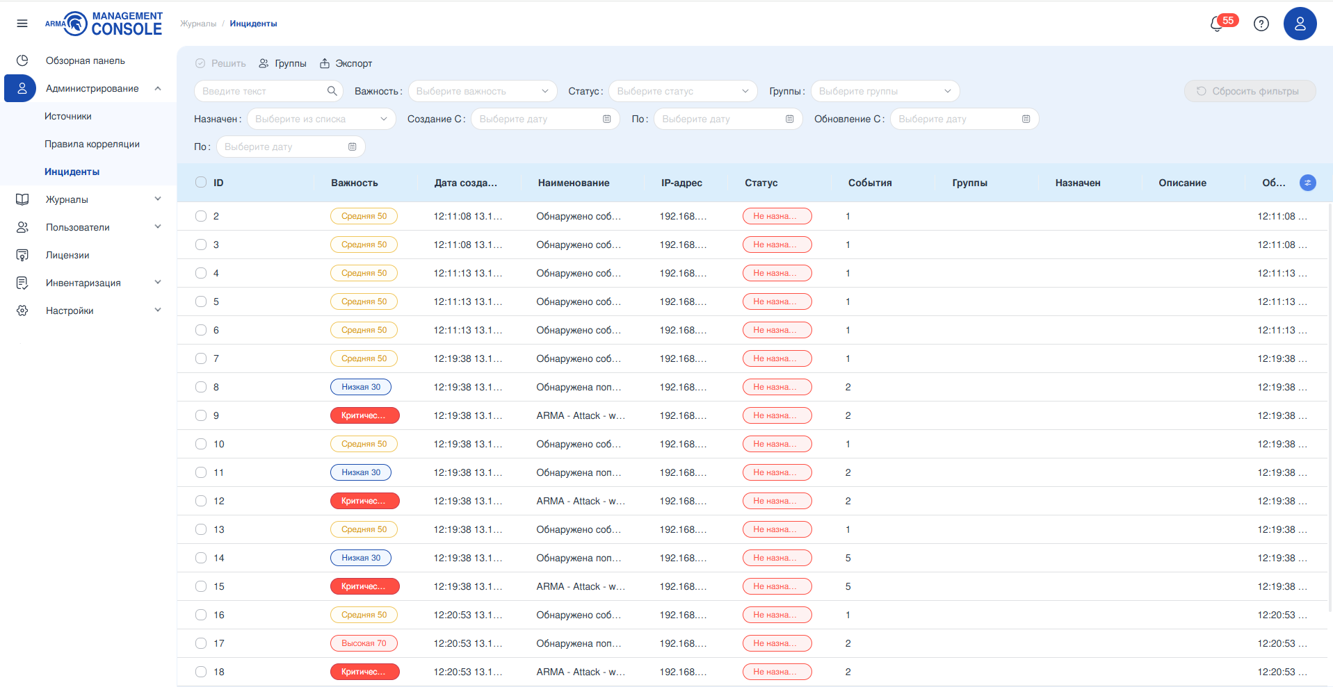 В подразделе «Инциденты» отображаются инциденты, обнаруженные подключёнными к ARMA MC устройствами.