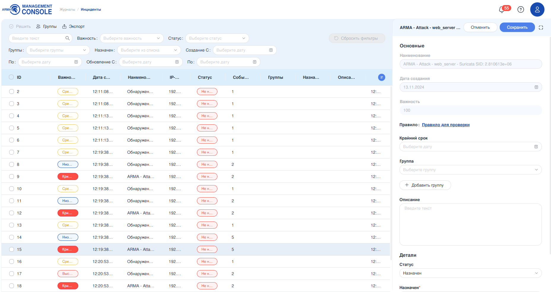 «Назначен» – имя пользователя, на которого назначен инцидент для расследования;