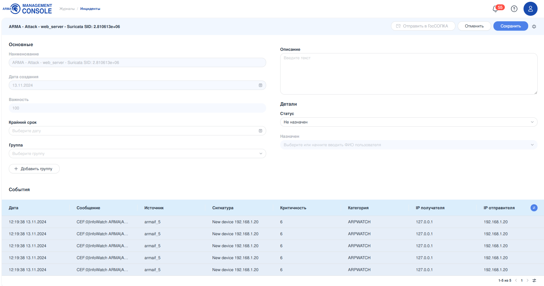 «Статус» – статус инцидента для расследования офицером ИБ;