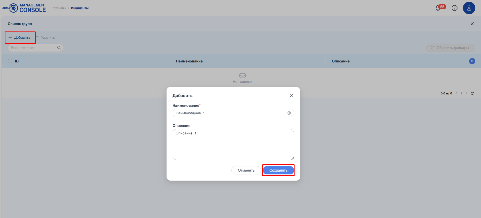 «Группы» – группа, в которую определён инцидент. Группы назначаются пользователем и используются для удобства фильтрации;
