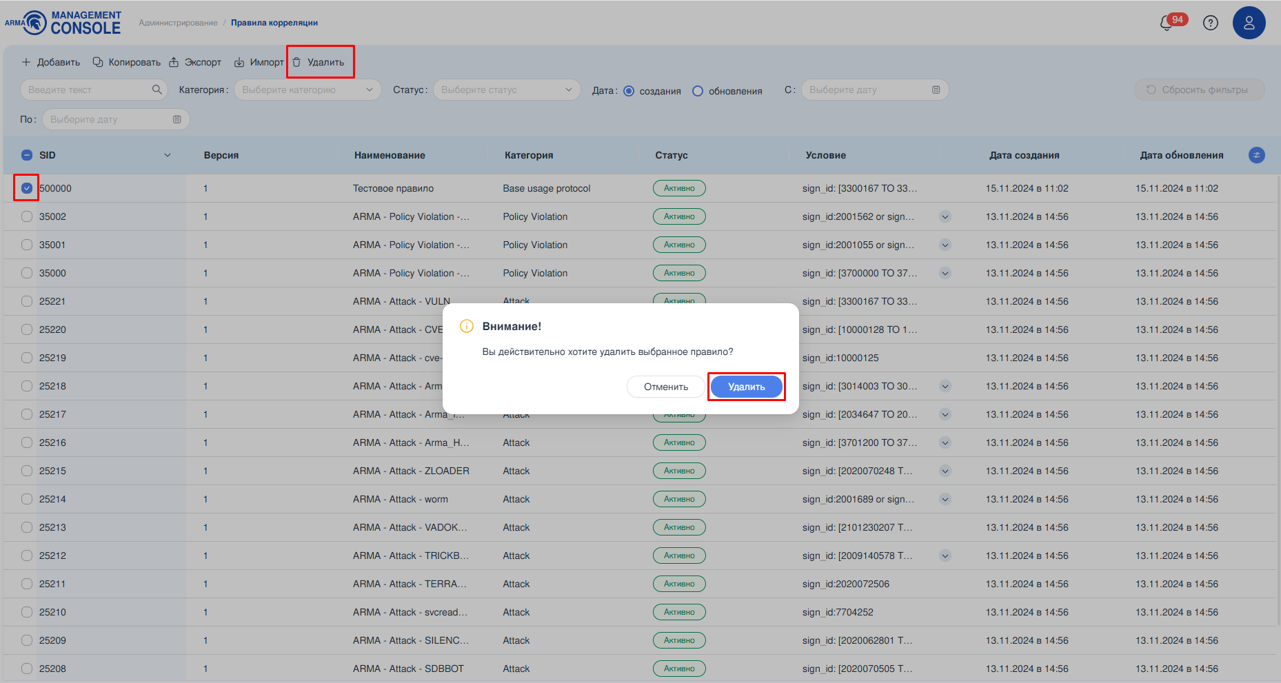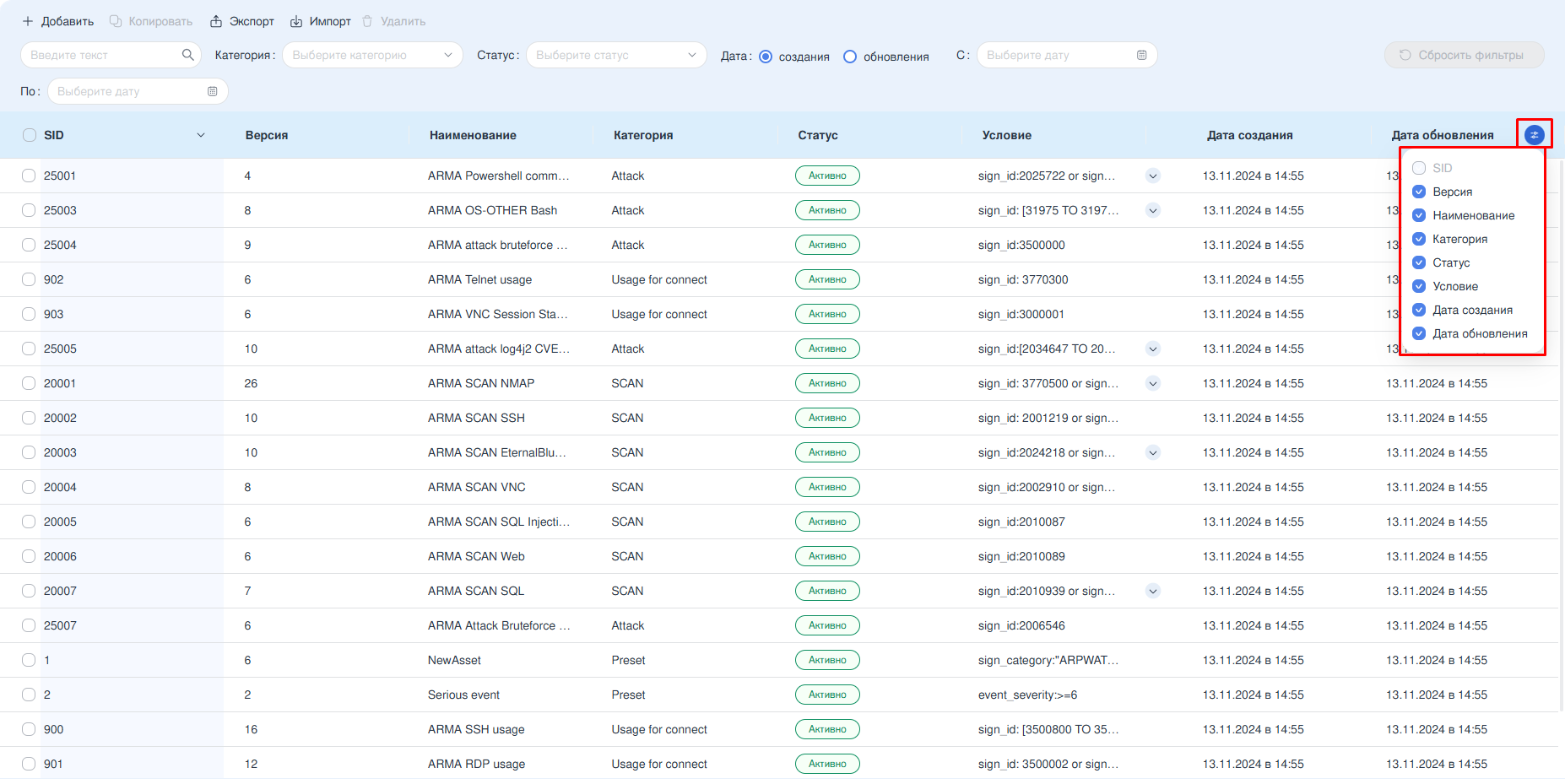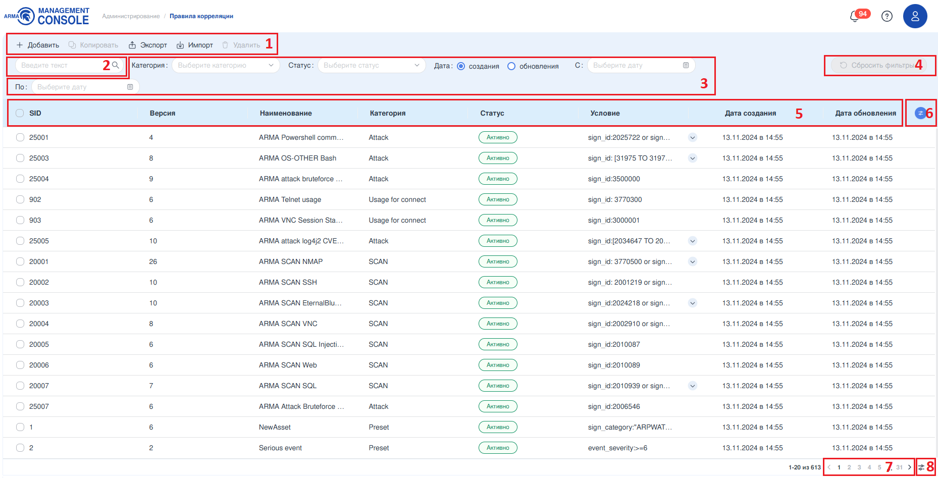 В значительной части разделов меню ARMA MC информация представлена в формате таблицы. В качестве примера приведена организация информации в табличном формате в подразделе меню «Правила корреляции» (см. Рисунок – Подраздел «Правила корреляции» в формате таблицы).