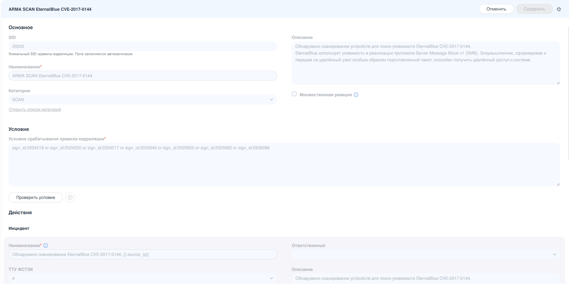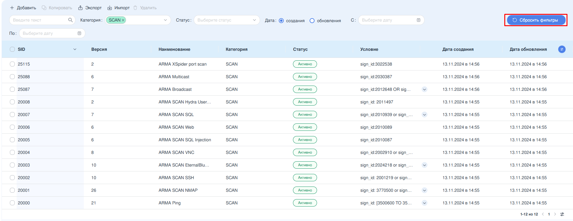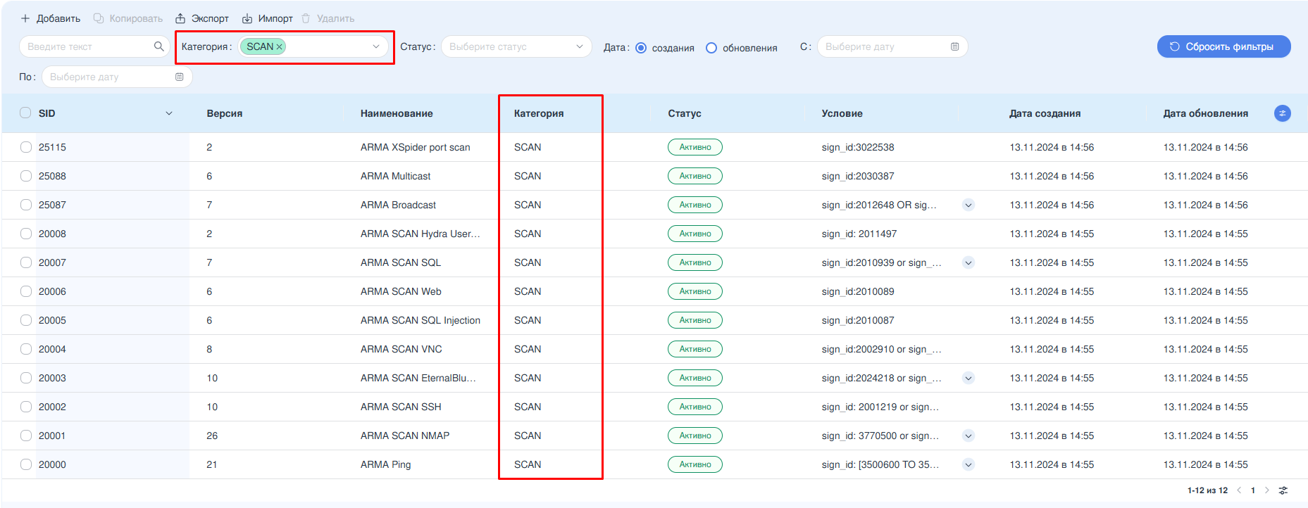 Для осуществления фильтрации необходимо выбрать значение из выпадающего списка необходимого поля фильтрации. В качестве примера приведена фильтрация правил корреляции по полю «Категория» со значением «SCAN» (см. Рисунок – Пример фильтрации по полю «Категория»).