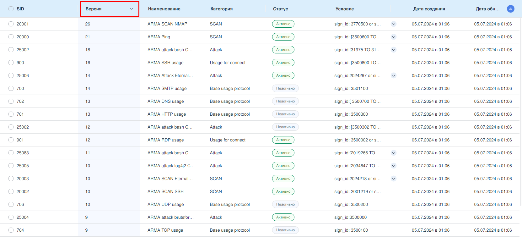 В качестве примера приведена сортировка правил корреляции по убыванию по столбцу «Версия» (см. Рисунок – Пример сортировки по полю «Версия»).