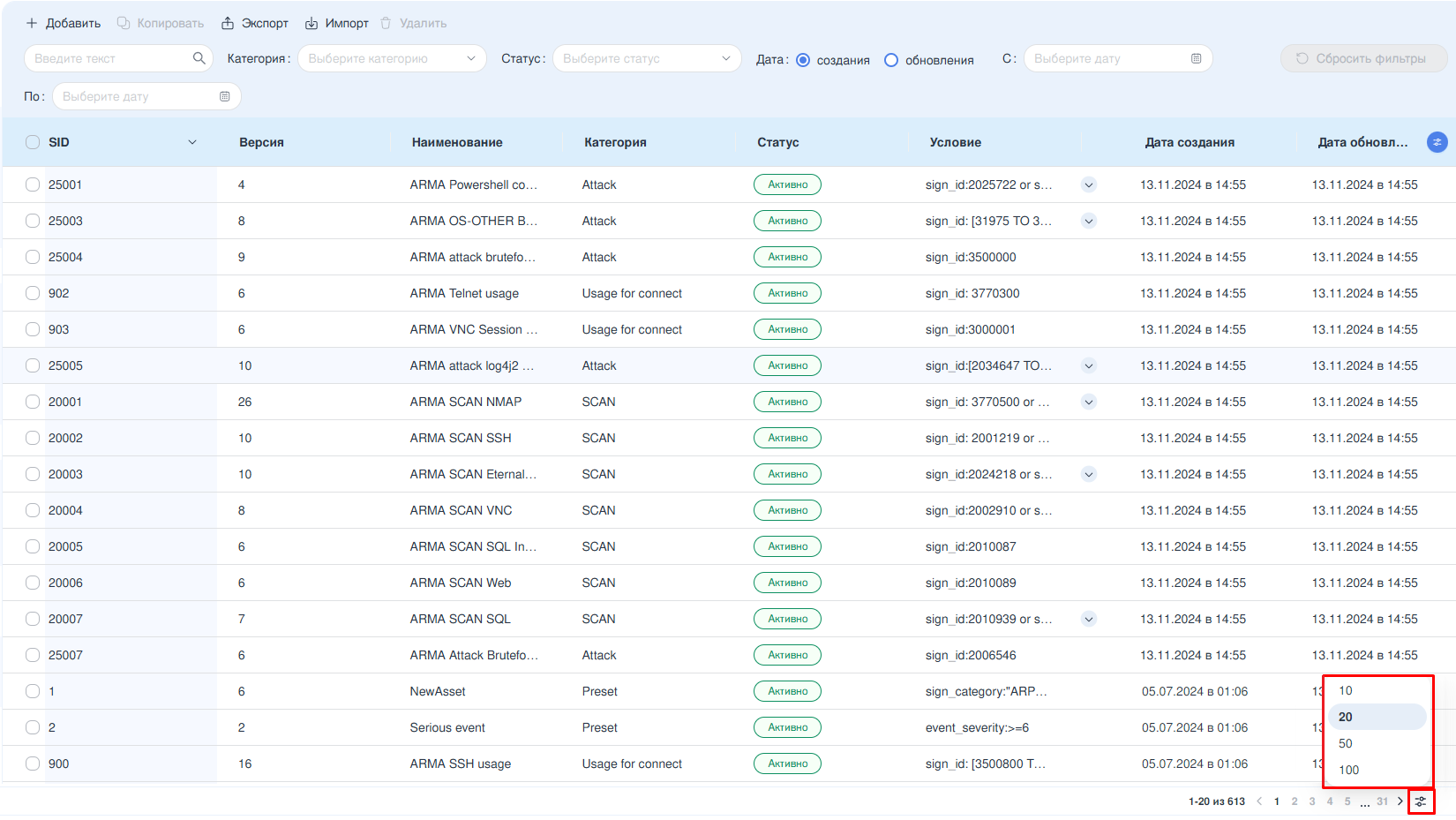 » в правом нижнем углу экрана и указать количество записей в открывшемся выпадающем списке (см. Рисунок – Выбор количества отображаемых записей).