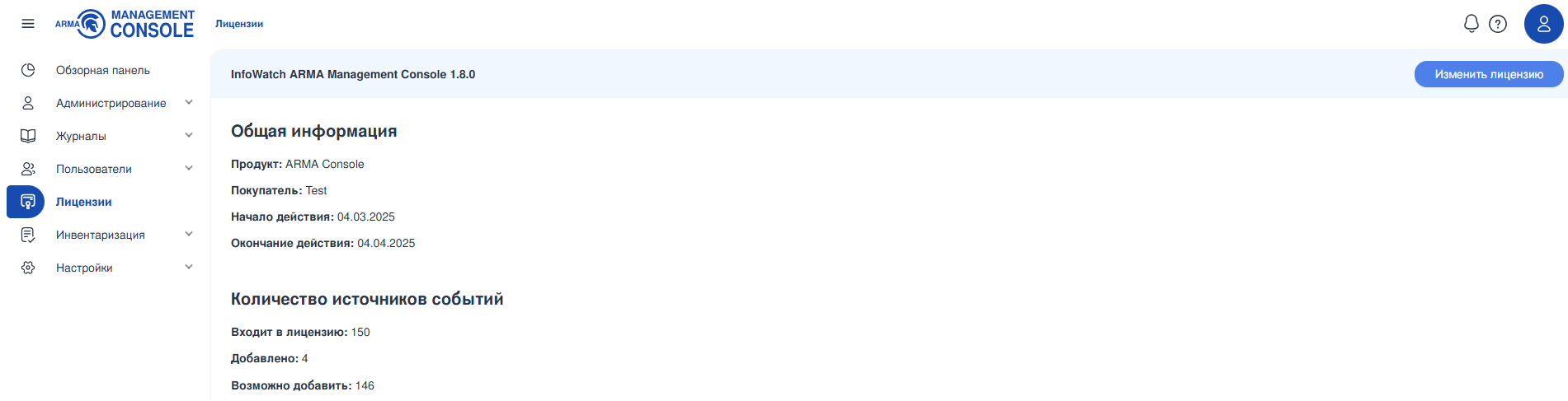 Активация и изменение лицензии описаны в руководстве администратора ARMA MC (см. Управление лицензиями).