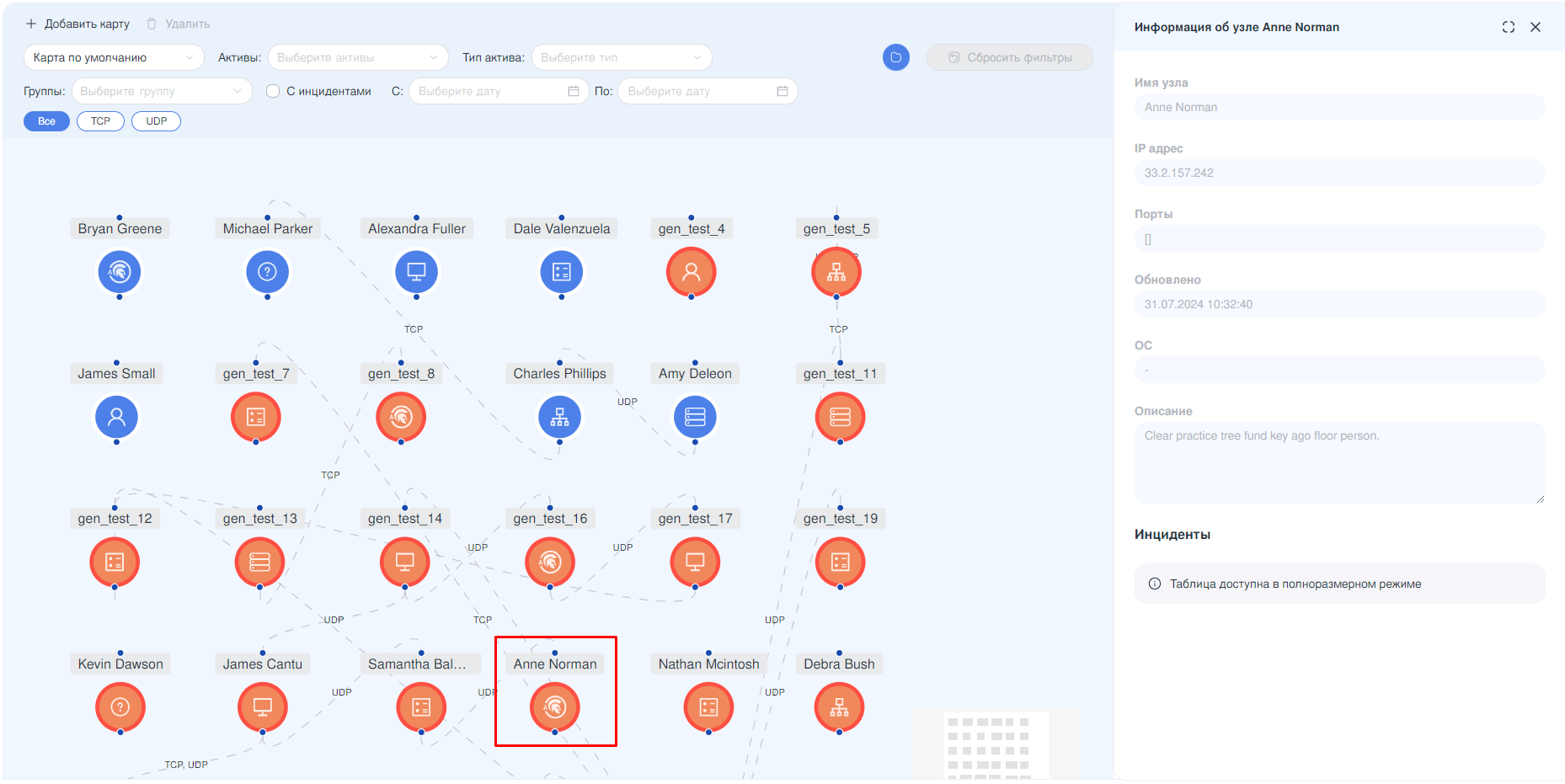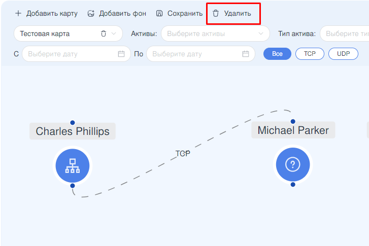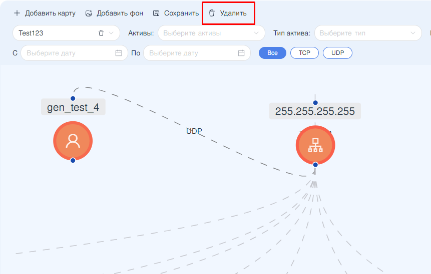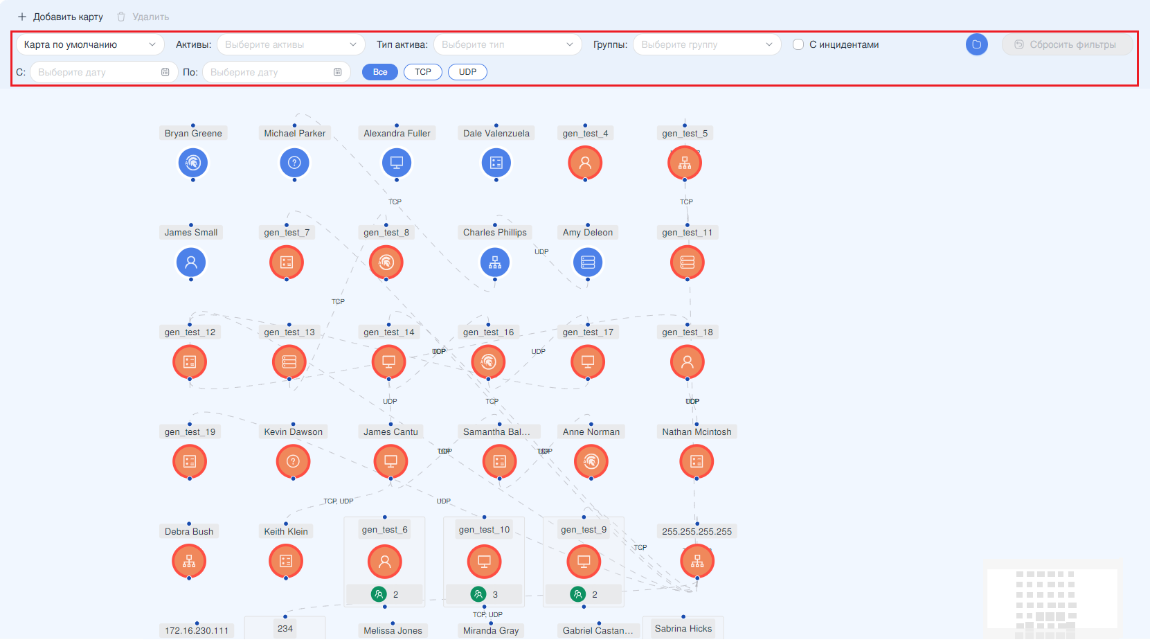 Переключатель «Все/TCP/UDP» позволяет отфильтровать активы с созданными связями. Значение «TCP» отображает активы, между которыми существует связь по TCP, значение «UDP» отображает активы, между которыми существует связь по UDP. По умолчанию выбрано значение «Все».