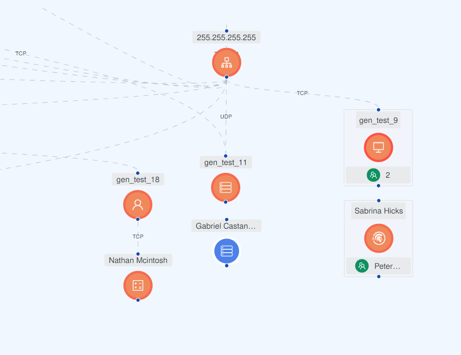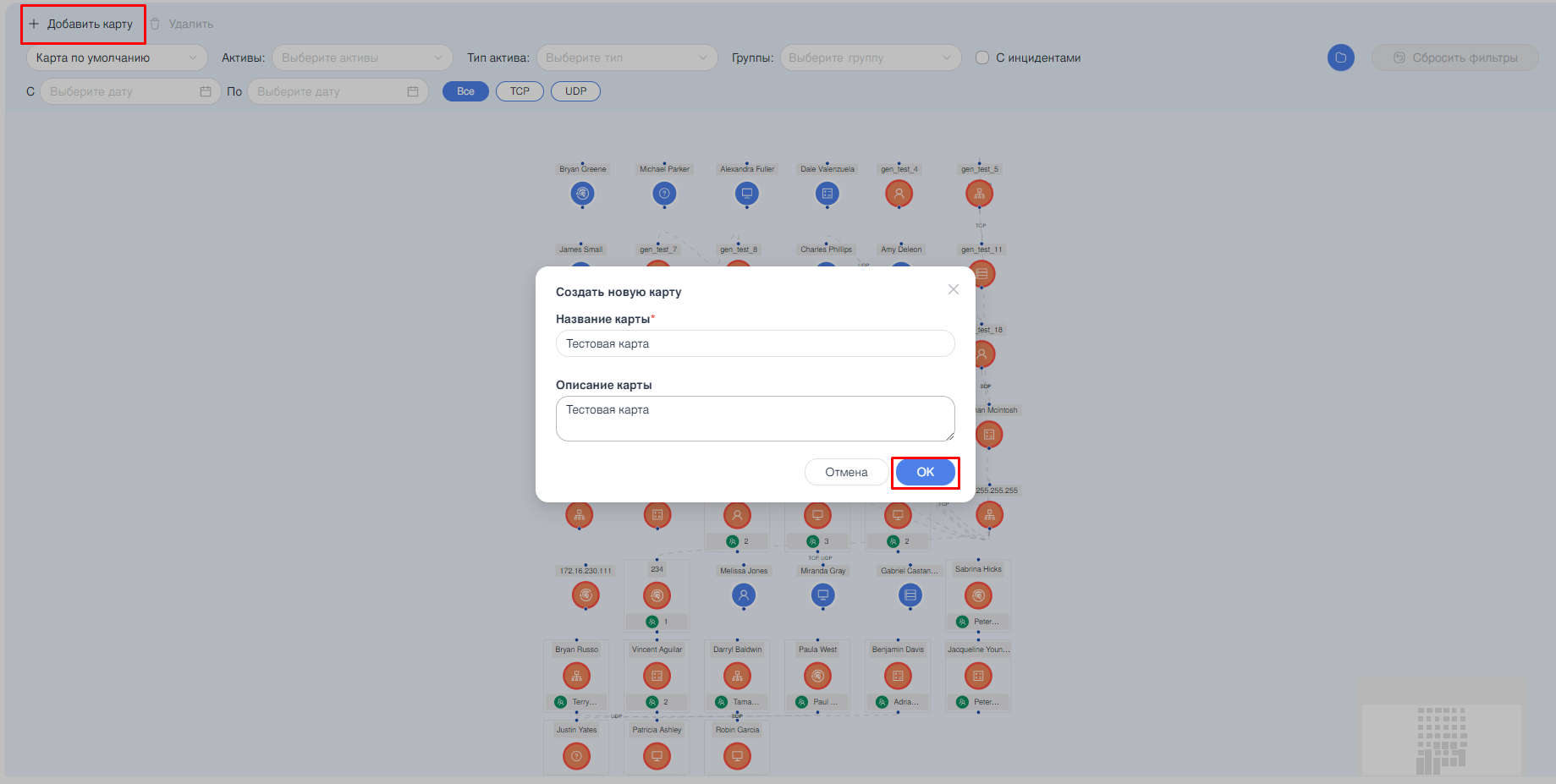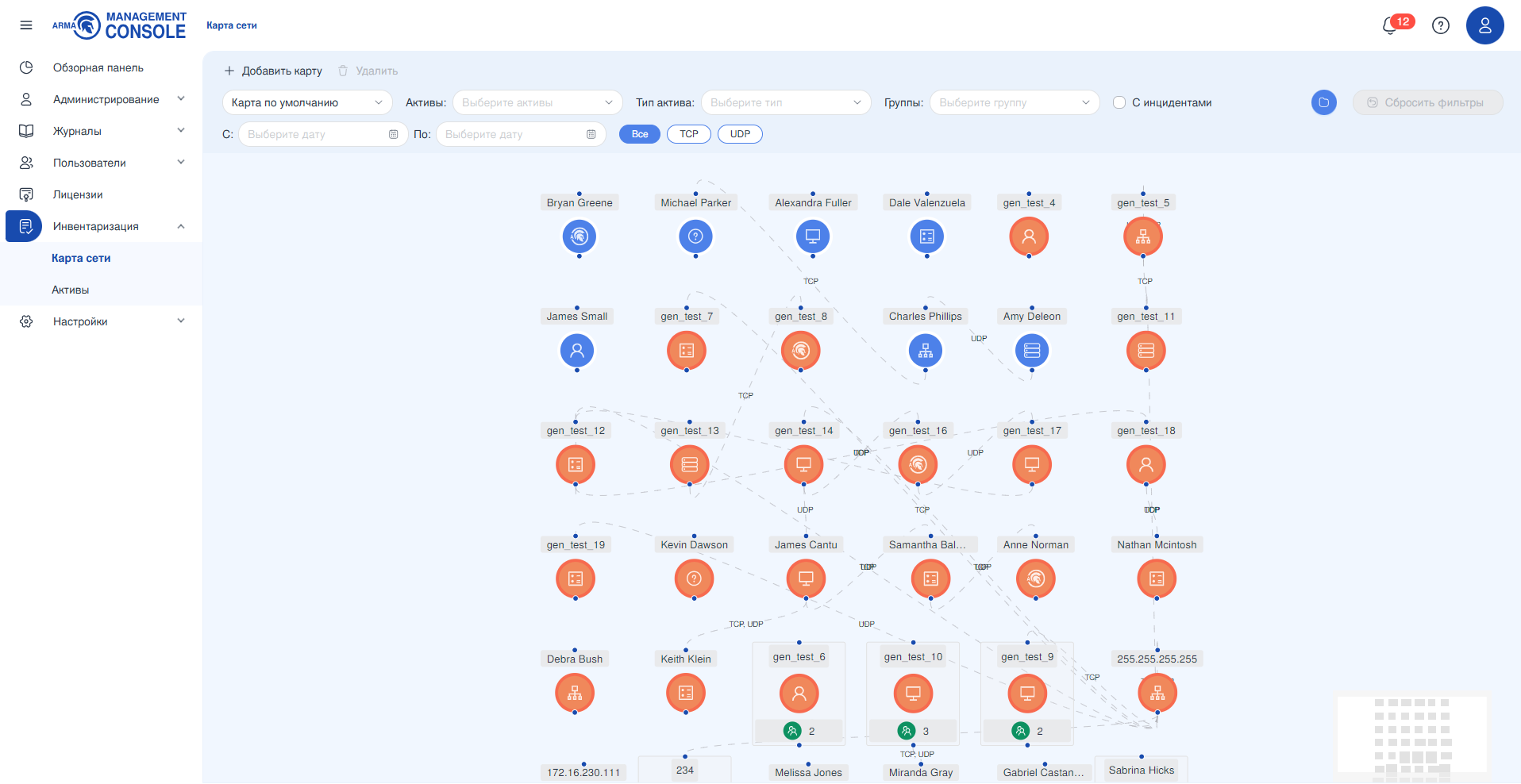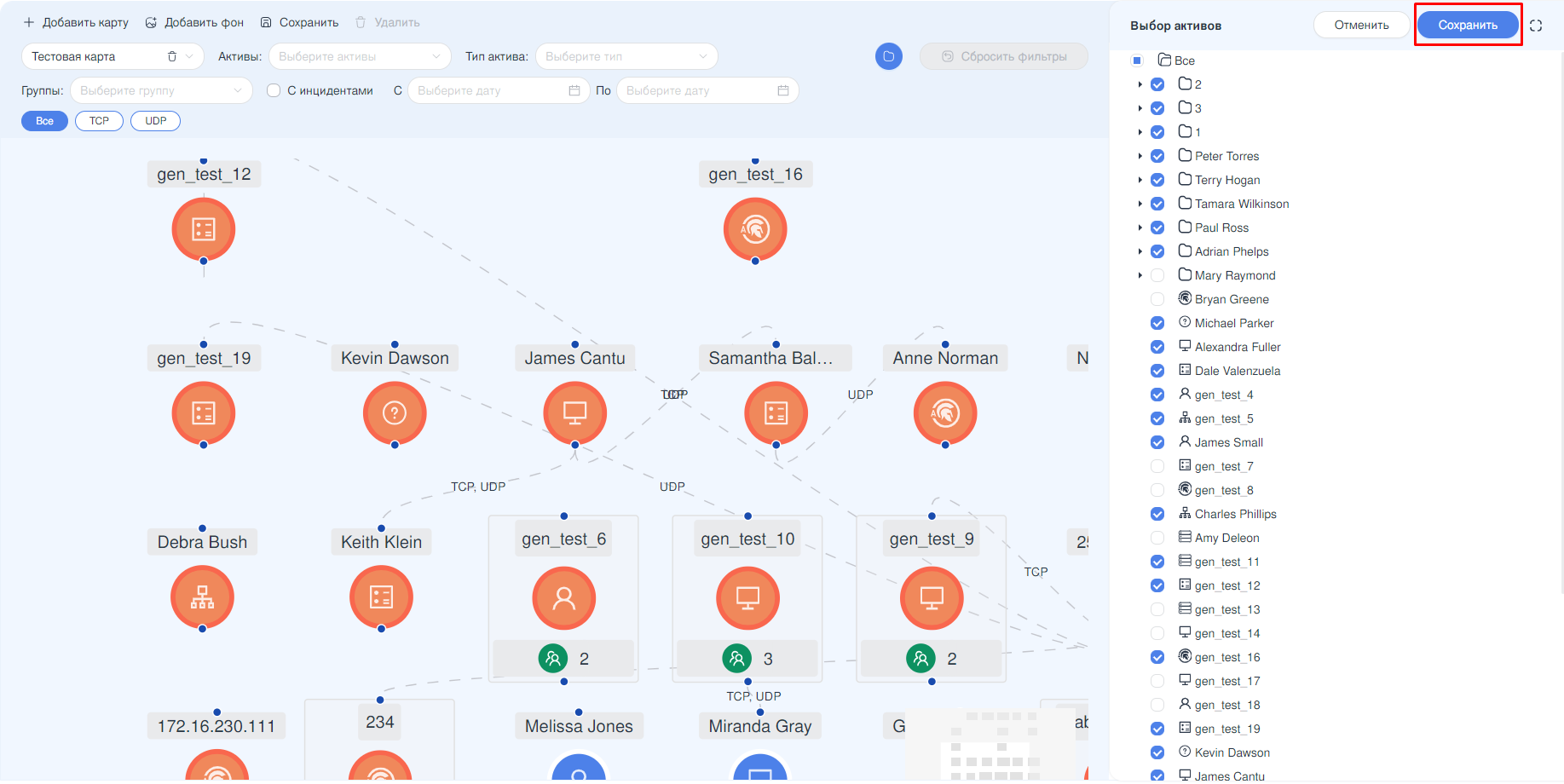 Переключатель «Все/TCP/UDP» позволяет отфильтровать активы с созданными связями. Значение «TCP» отображает активы, между которыми существует связь по TCP, значение «UDP» отображает активы, между которыми существует связь по UDP. По умолчанию выбрано значение «Все».