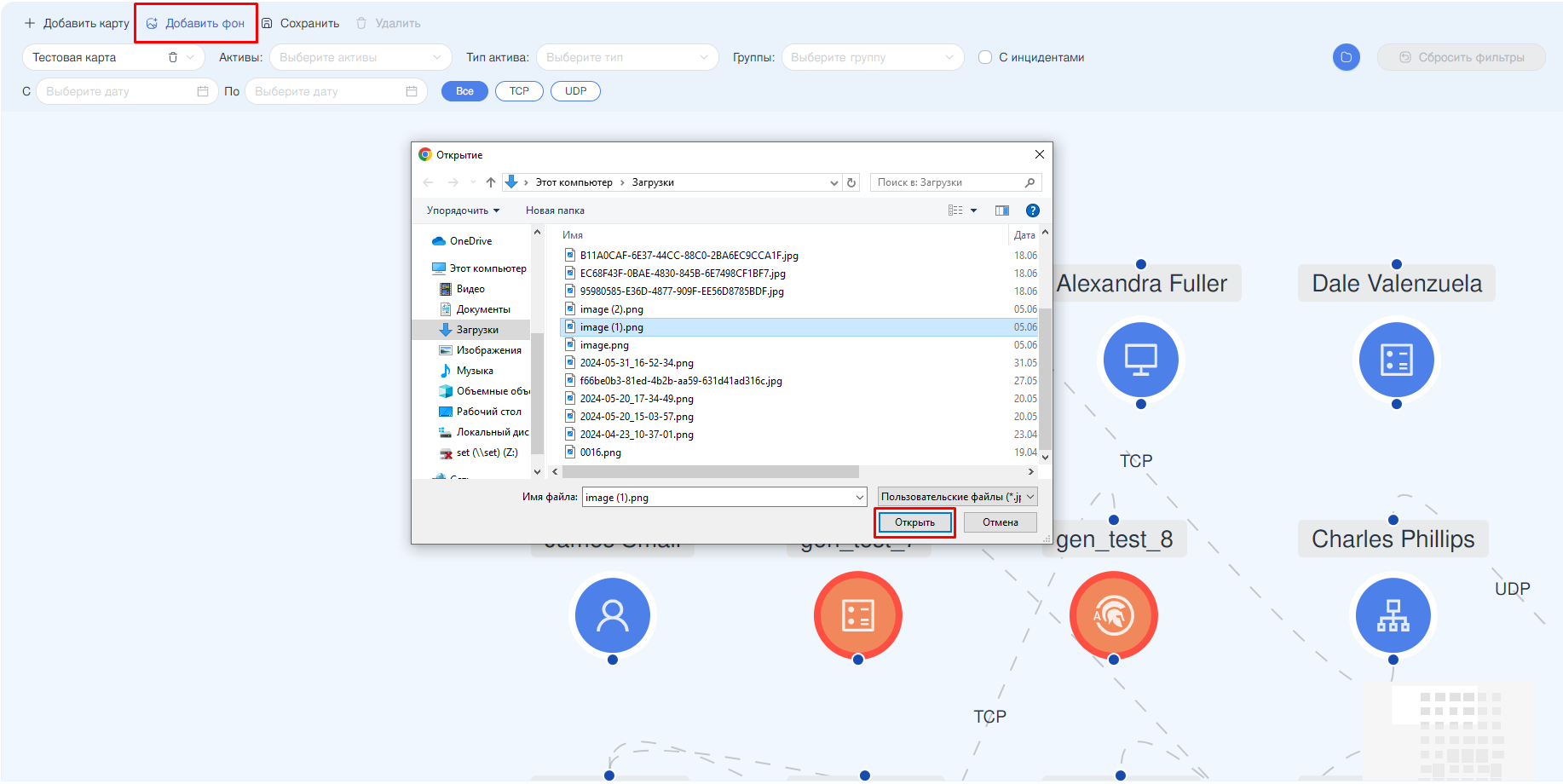 Для добавления фонового изображения на карту сети, например, схемы помещения, необходимо на панели инструментов нажать кнопку «Добавить фон», в открывшемся окне проводника выбрать необходимый файл фонового изображения и нажать кнопку «Открыть» (см. Рисунок – Добавление фона). Доступные форматы фонового изображения – «jpeg», «jpg», «png», «webp». После добавления фонового изображения существует возможность увеличить изображение до необходимых масштабов, нажав на край изображения и растянув его.