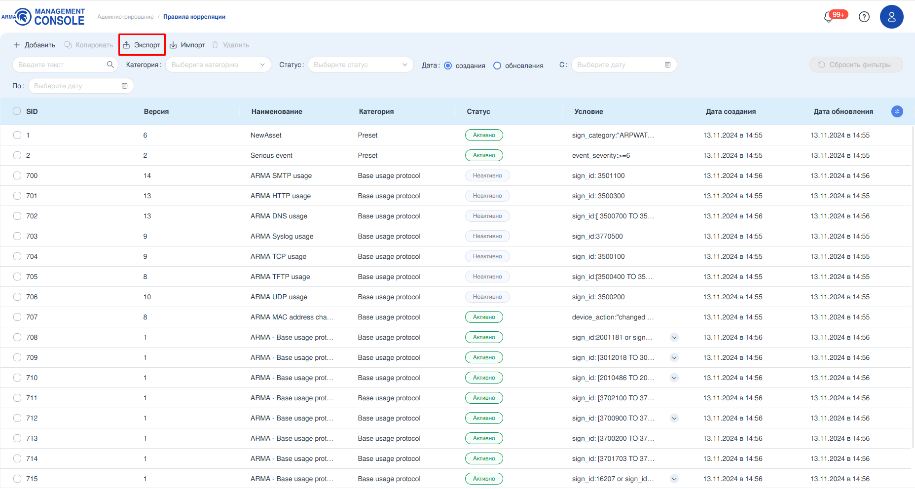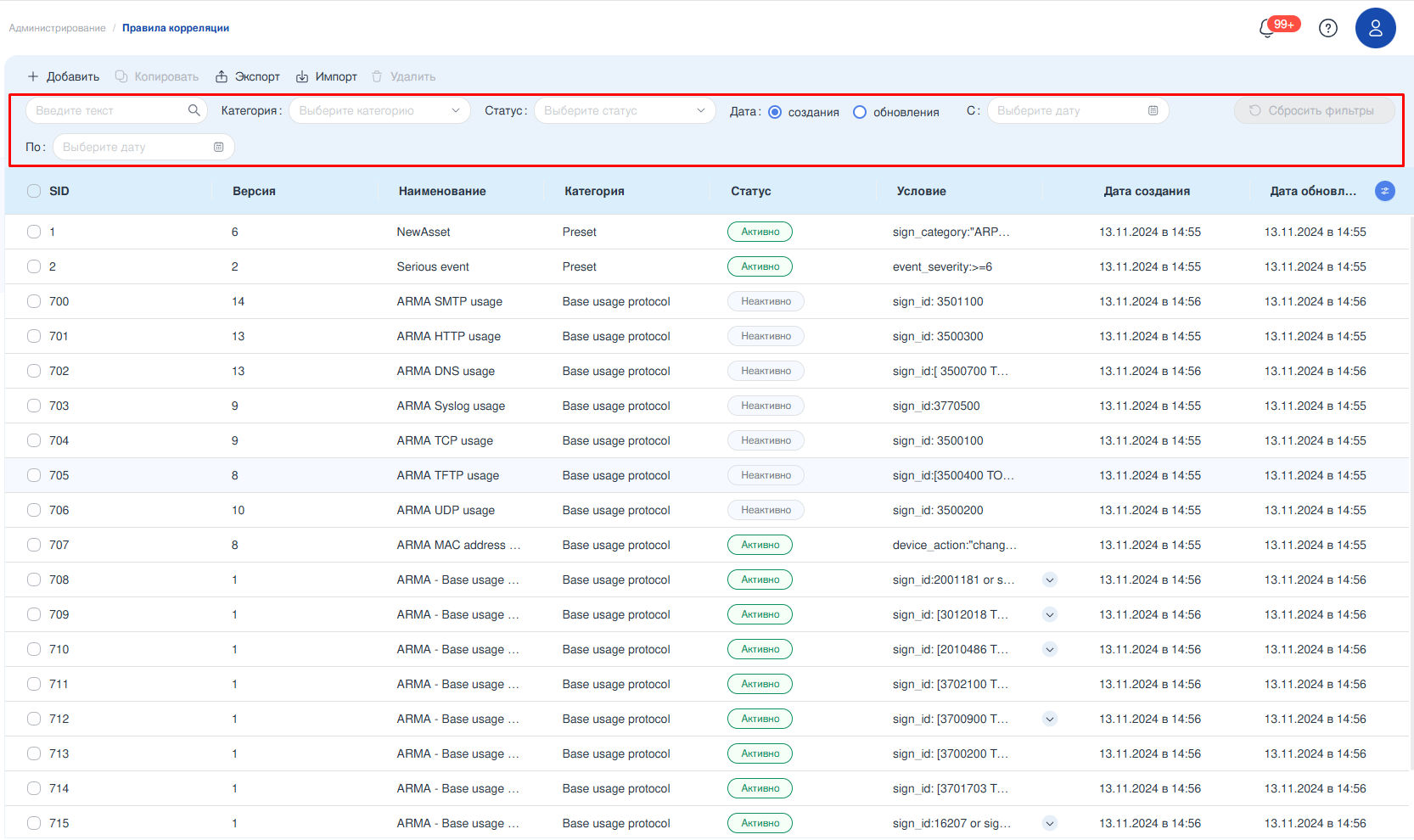 «обновления» – для фильтрации данных по дате обновления правила корреляции.