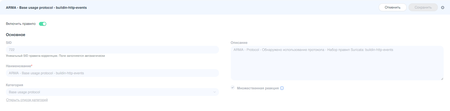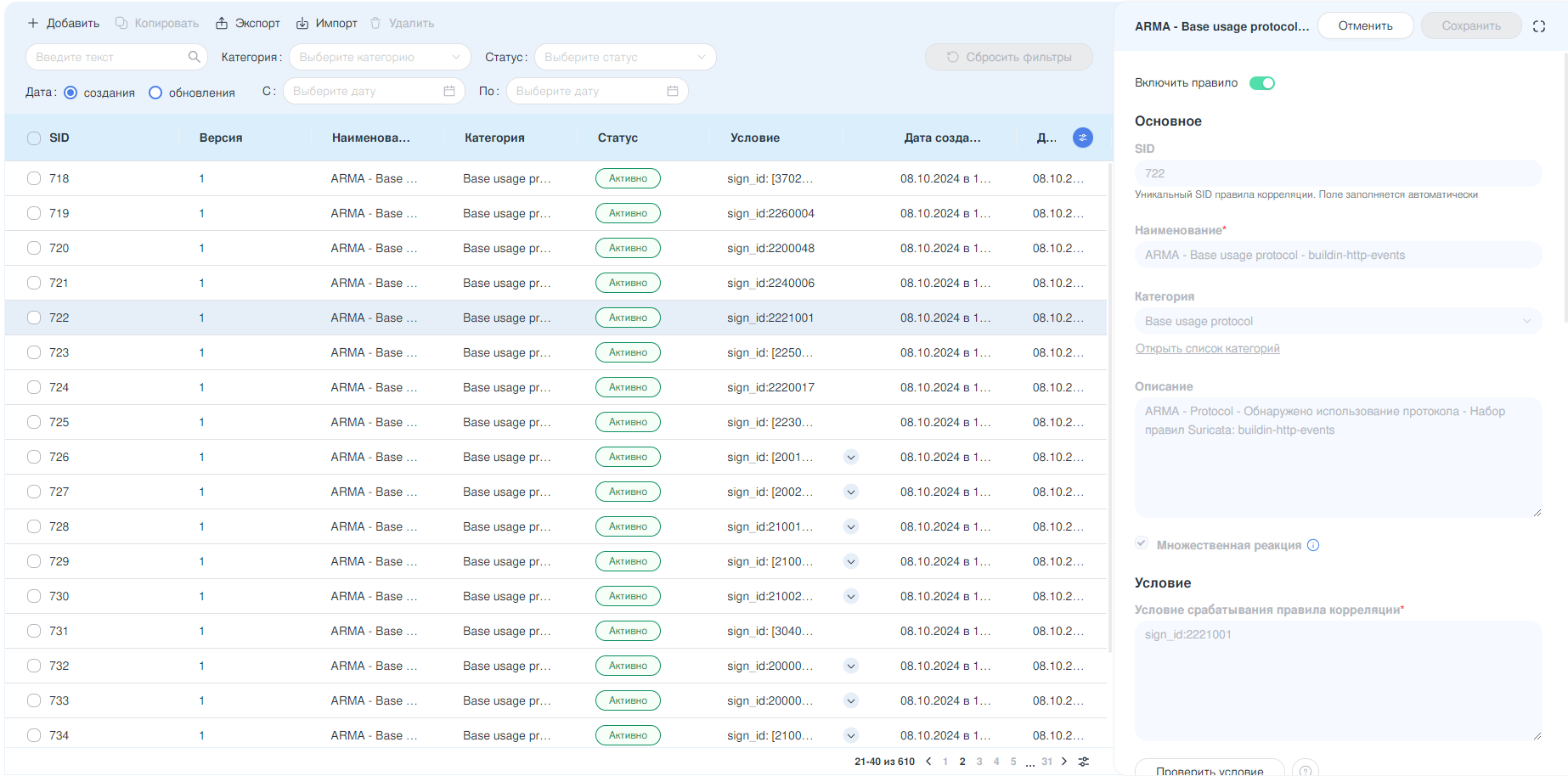 Пользовательские правила (SID от 500 000 до 1 000 000) – правила, которые создаёт пользователь. Правила данной категории возможно редактировать через карточку правил корреляции.