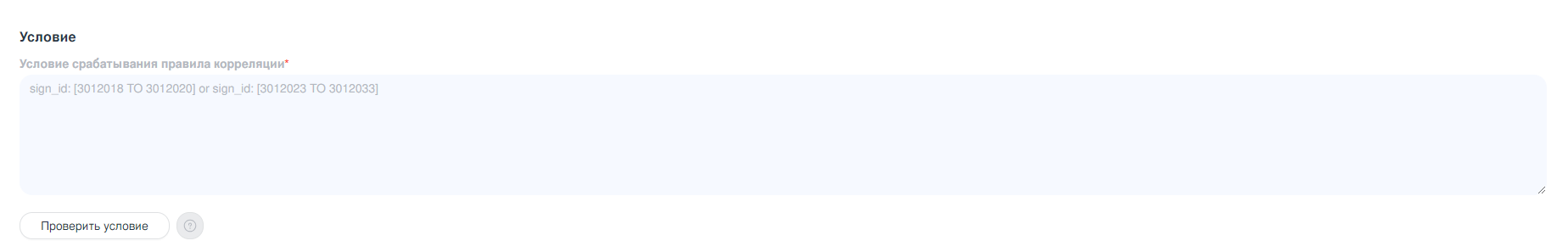 в поле «Условие срабатывания правила корреляции» ввести условия срабатывания правила с помощью специального синтаксиса. Условия правила корреляции задаются на основании деталей события, для которого предназначено правило;