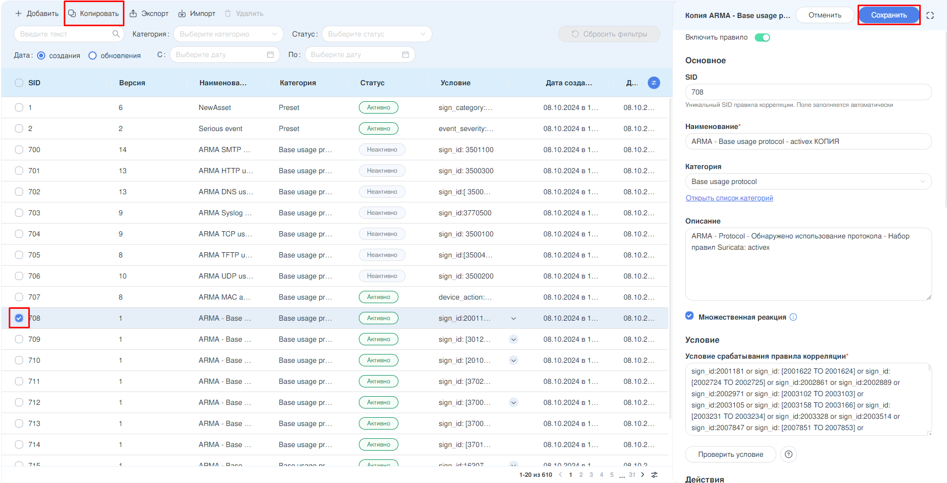 В открывшейся карточке правила внести необходимые изменения и нажать кнопку «Сохранить» в правом верхнем углу карточки (см. Рисунок – Копирование правила корреляции).