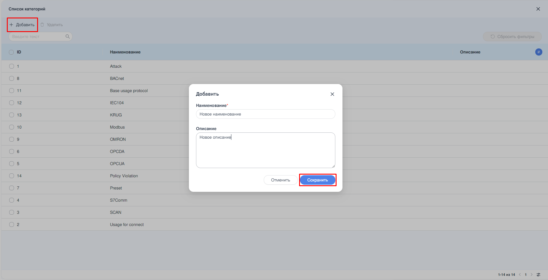 в случае, если ни одна из предустановленных категорий не подходит, существует возможность добавить пользовательскую категорию. Для этого необходимо открыть список категорий, нажать кнопку «Добавить», в открывшемся окне ввести «Наименование» и «Описание категории», затем нажать кнопку «Сохранить» (см. Рисунок – Добавление категории);
