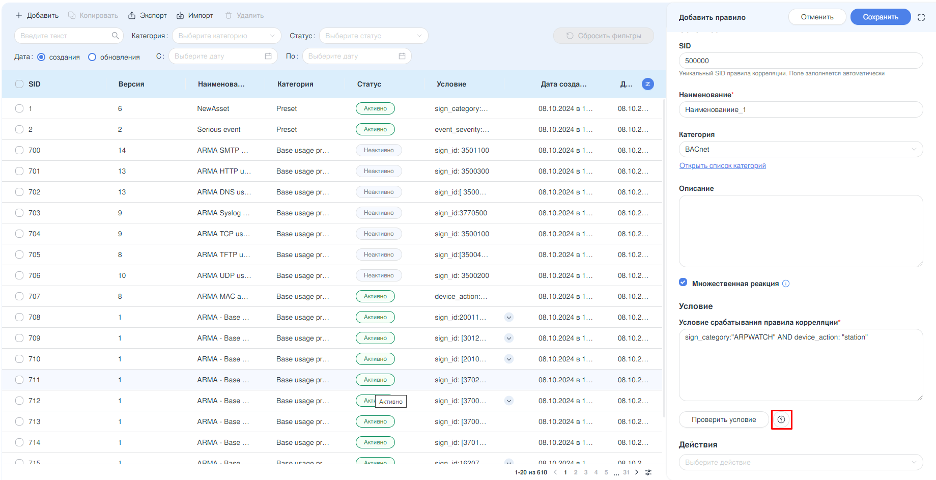 «Статус» – состояние правила корреляции («Активно»/«Неактивно»);