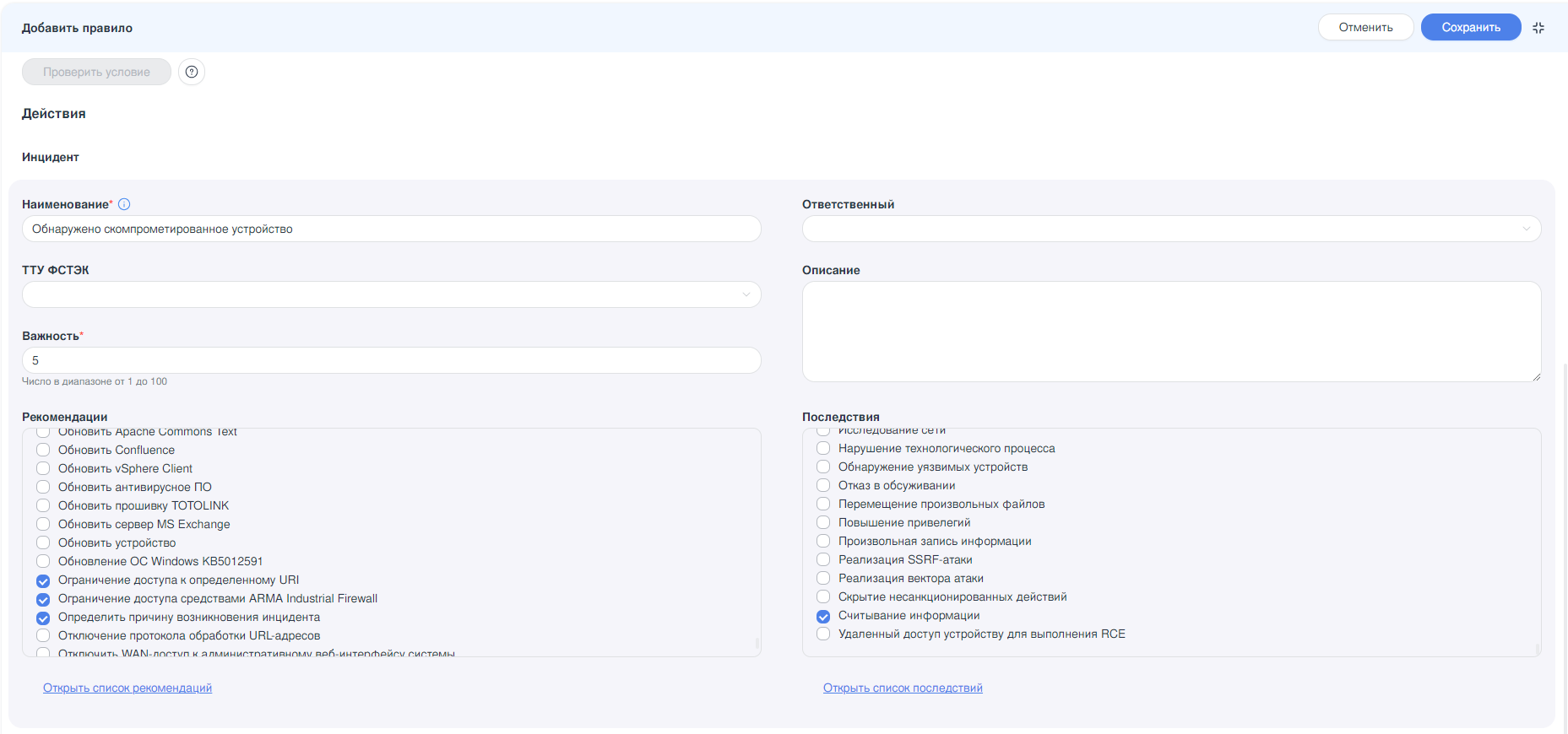 Блок «Действие» содержит список действий при срабатывании конкретного правила корреляции, а также подробные настройки каждого типа действия (см. Рисунок – Карточка. Блок «Действие»).