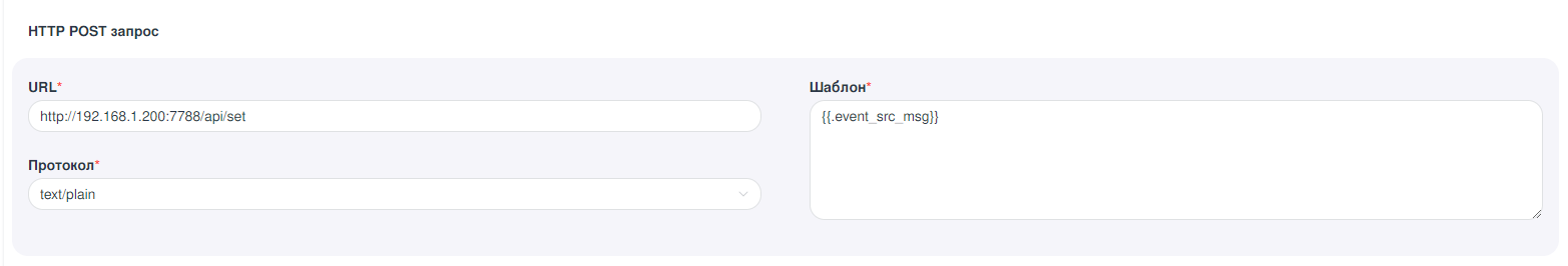 Тип действия «HTTP POST запрос» позволяет отправлять информацию на внешний сервер при срабатывании определённого события. Предварительно необходимо убедиться в наличии доступа к используемому внешнему серверу.