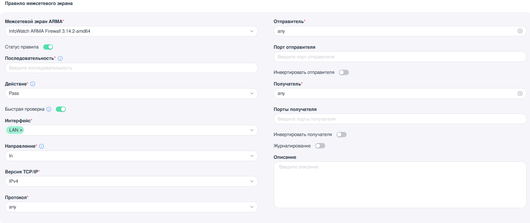 В поле «Межсетевой экран ARMA» выбрать необходимый межсетевой экран из списка подключённых к ARMA MC.