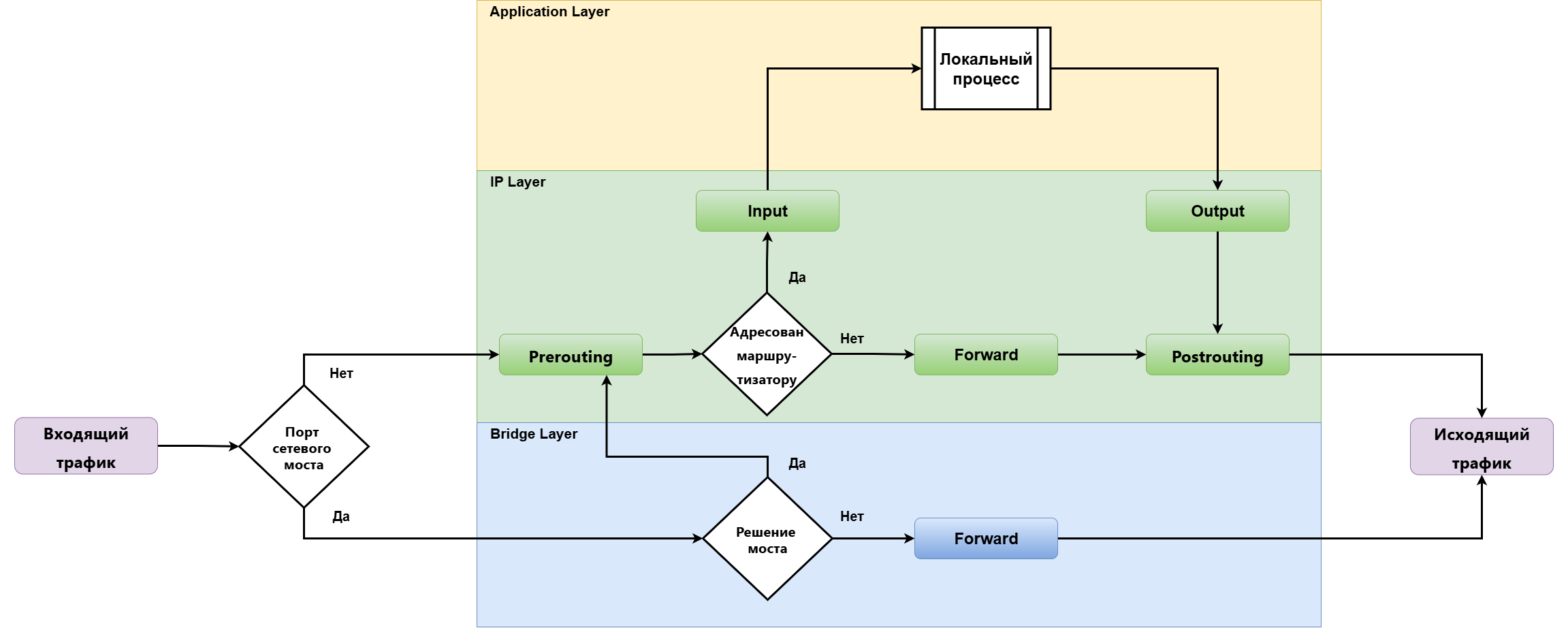 Для наглядного представления логики обработки пакетов и возможных маршрутов их прохождения ниже приведена упрощённая схема потока трафика, основанная на стандартной архитектуре обработки пакетов Netfilter (см. Рисунок – Cхема потока трафика).