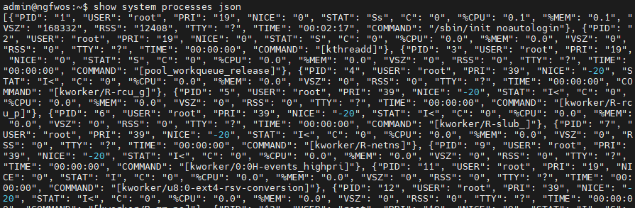 json — выводит древовидную структуру процессов в формате JSON, предназначенном для программной обработки и интеграции с внешними системами (см. Рисунок – Мониторинг процессов в формате JSON).